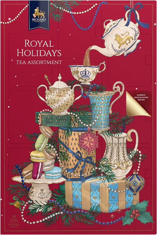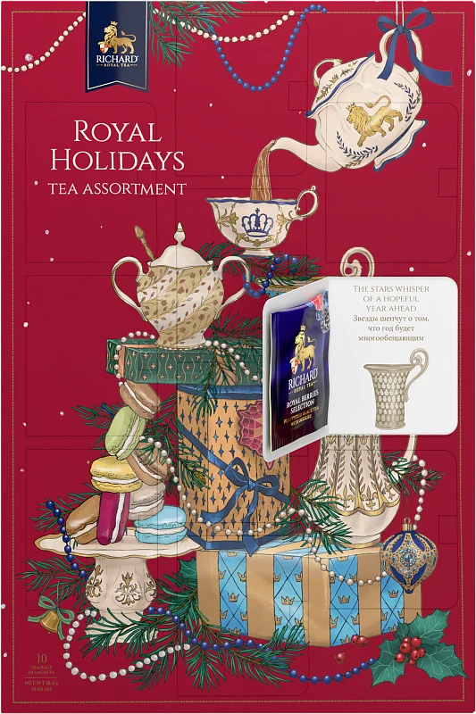 The large assorted postcard with 10 flavors of excellent RICHARD® tea. Tea bags in sachets are placed in perforated windows, each of which contains a Royal New Year predictions inside. Which wish will you get?