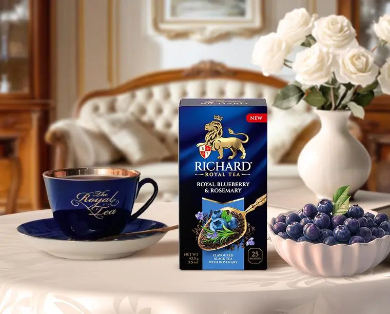 Ароматный черный чай со свежим вкусом голубики сорта Bluegold, натуральным розмарина и мяты.
