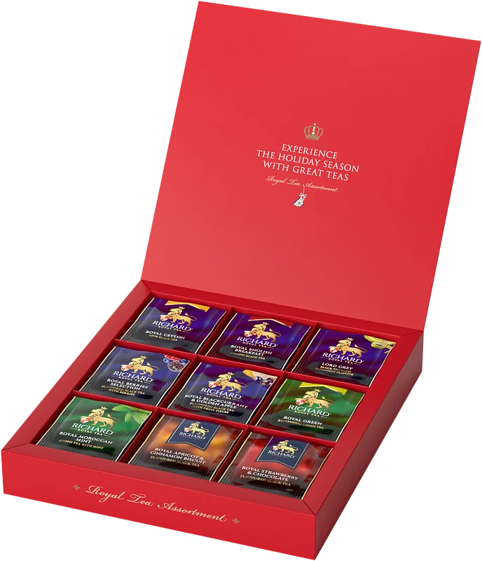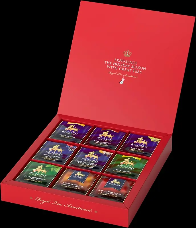 Ассорти чая с рождественским венком. В состав ассорти входят классические черные чаи, чаи с кусочками ягод и фруктов, и два лимитированных зимних вкуса: с абрикосом и печеньем с корицей, а также с клубникой и шоколадом.